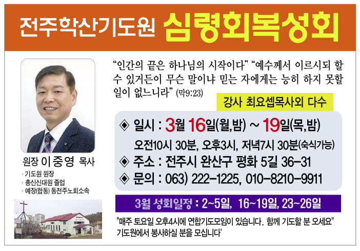 전주학산기도원 : 3월 심령회복성회 (3/16-19, 23-26)
