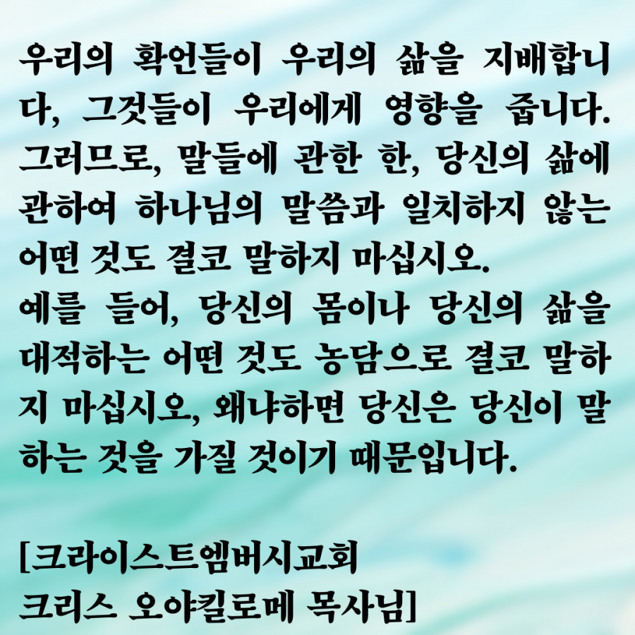 우리의 확언들이 우리의 삶을 지배합니다, 그것들이 우리에게 영향을 줍니다. 그러므로, 말들에 관한 한, 당신의 삶에 관하여 하나님의 말씀과 일치하지 않는 어떤 것도 결코 말하지 마십시오. 예를 들어, 당신의 몸이나 당신의 삶을 대적하는 어떤 것도 농담으로 결코 말하지 마십시오, 왜냐하면 당신은 당신이 말하는 것을 가질 것이기 때문입니다 (마가복음 11:23).