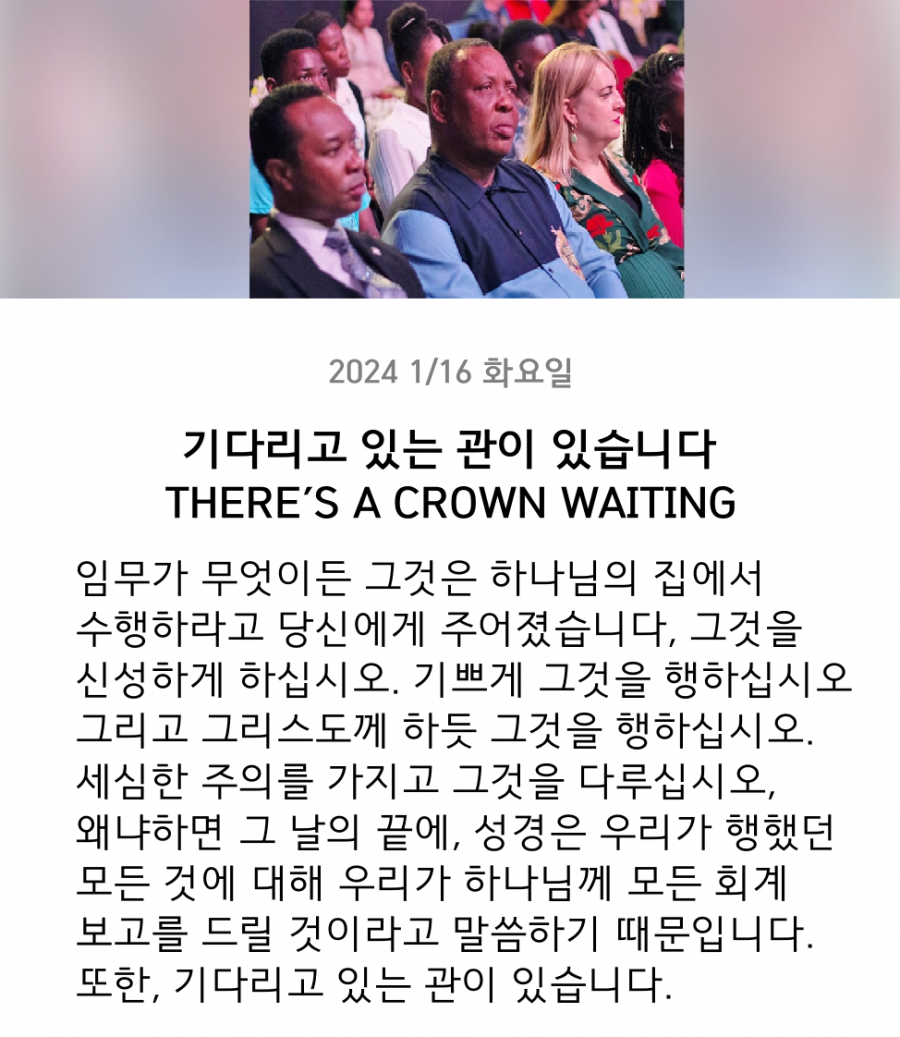 임무가 무엇이든 그것은 하나님의 집에서 수행하라고 당신에게 주어졌습니다, 그것을 신성하게 하십시오. 기쁘게 그것을 행하십시오 그리고 그리스도께 하듯 그것을 행하십시오. 세심한 주의를 가지고 그것을 다루십시오, 왜냐하면 그 날의 끝에, 성경은 우리가 행했던 모든 것에 대해 우리가 하나님께 모든 회계 보고를 드릴 것이라고 말씀하기 때문입니다. 또한, 기다리고 있는 관이 있습니다 그리고 그것은 그분에게 순종했고 그들의 임무를 성취한 모든 자들을 위한 의의 관입니다.