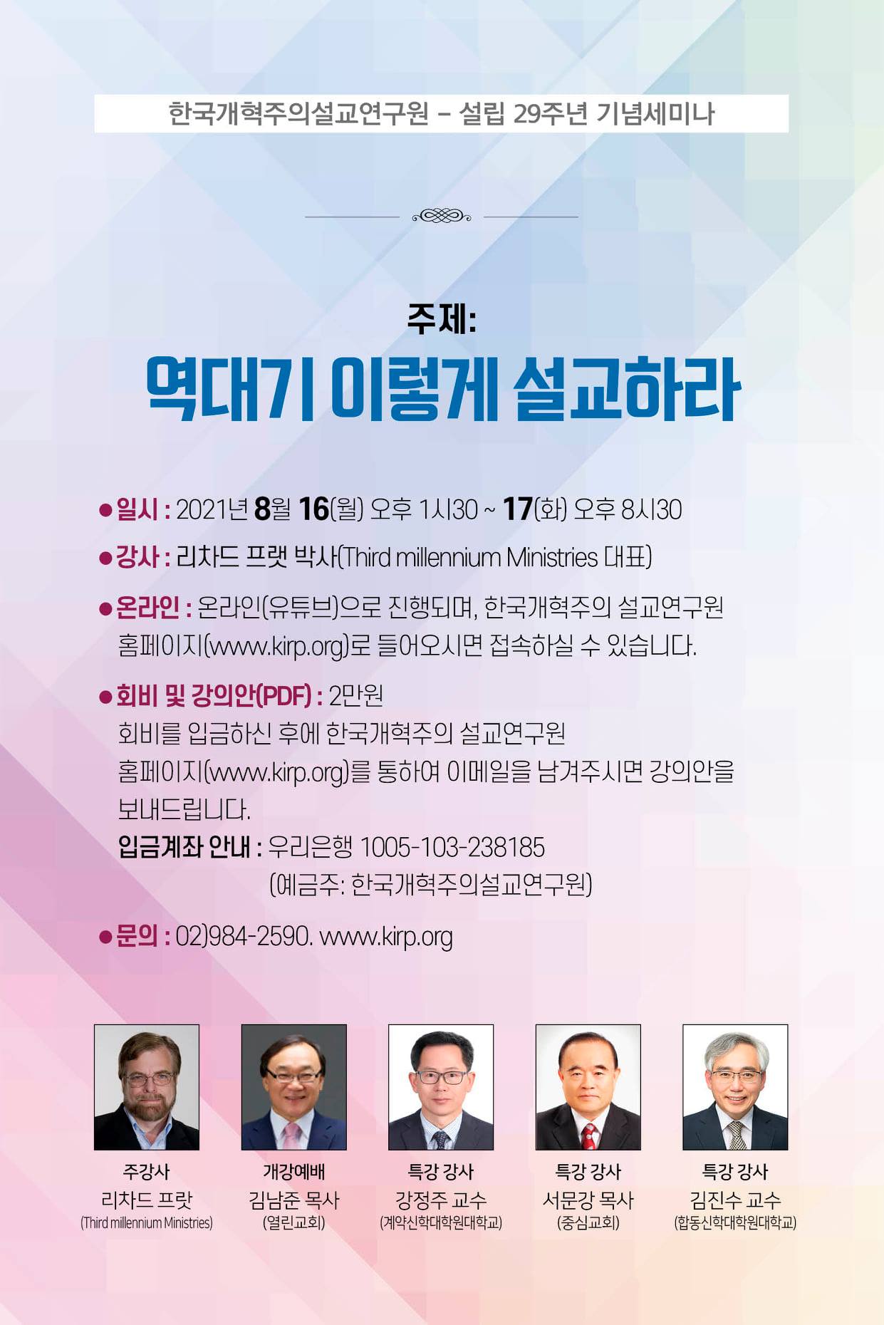 한국개혁주의설교연구원, 설립 29주년 기념세미나 (8/16-17)
