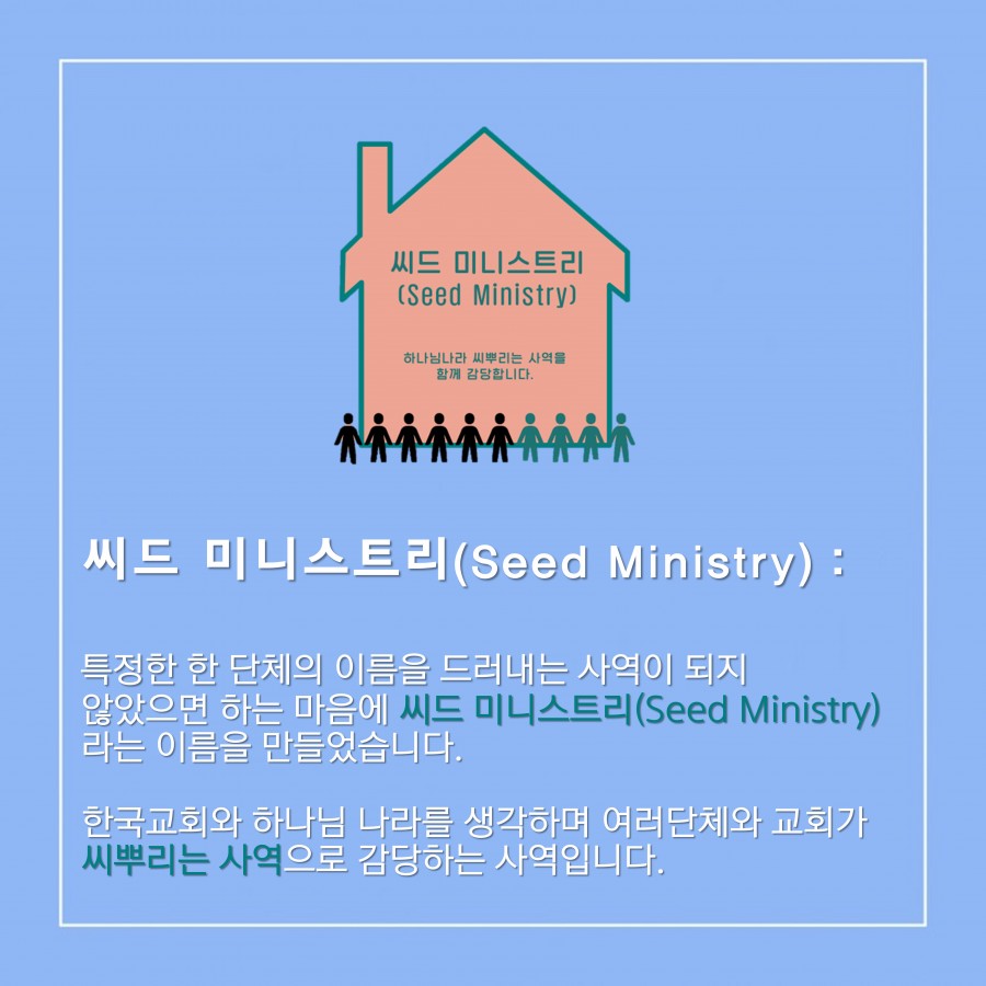 주관: 특정한 한 단체의 이름을 드러내는 사역이 되지 않게 하기 위하여 씨드 미니스트리(Seed Ministry) 라는 이름을 만들었습니다.