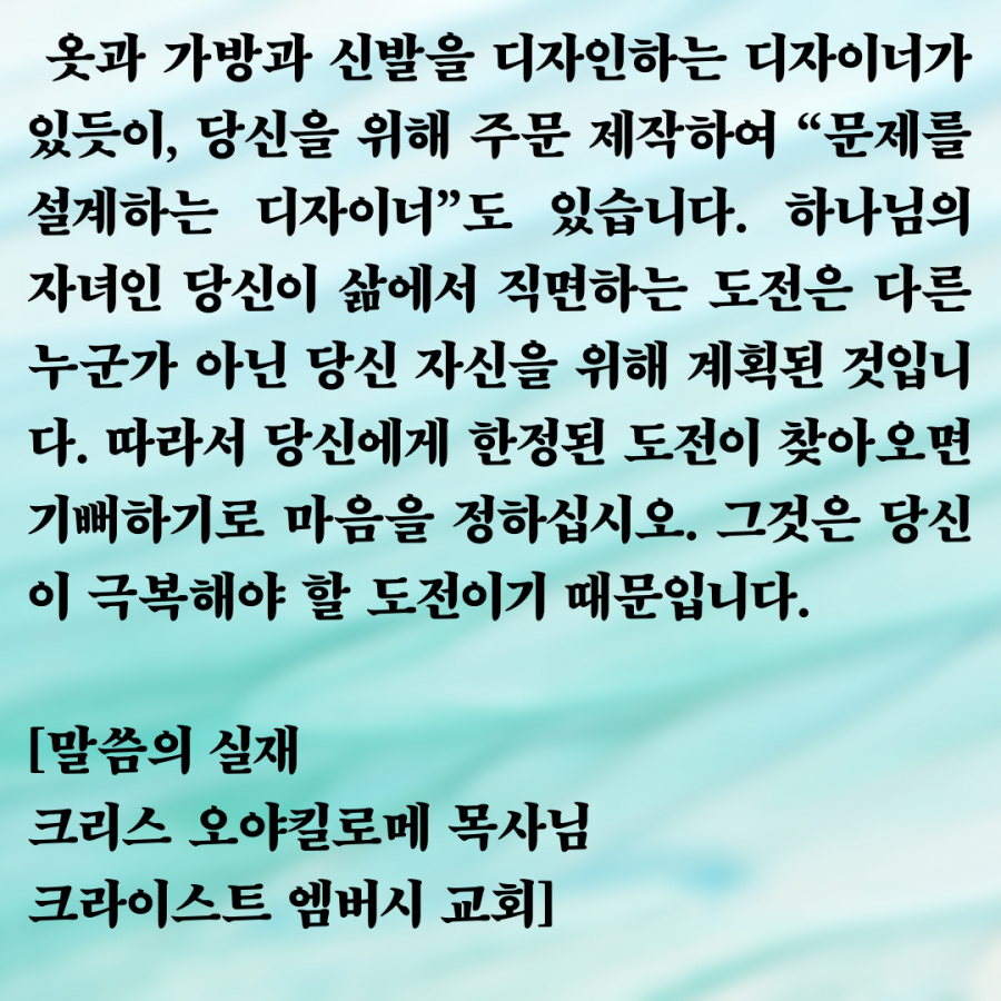 옷과 가방과 신발을 디자인하는 디자이너가 있듯이, 당신을 위해 주문 제작하여 “문제를 설계하는 디자이너”도 있습니다. 하나님의 자녀인 당신이 삶에서 직면하는 도전은 다른 누군가 아닌 당신 자신을 위해 계획된 것입니다. 따라서 당신에게 한정된 도전이 찾아오면 기뻐하기로 마음을 정하십시오. 그것은 당신이 극복해야 할 도전이기 때문입니다.