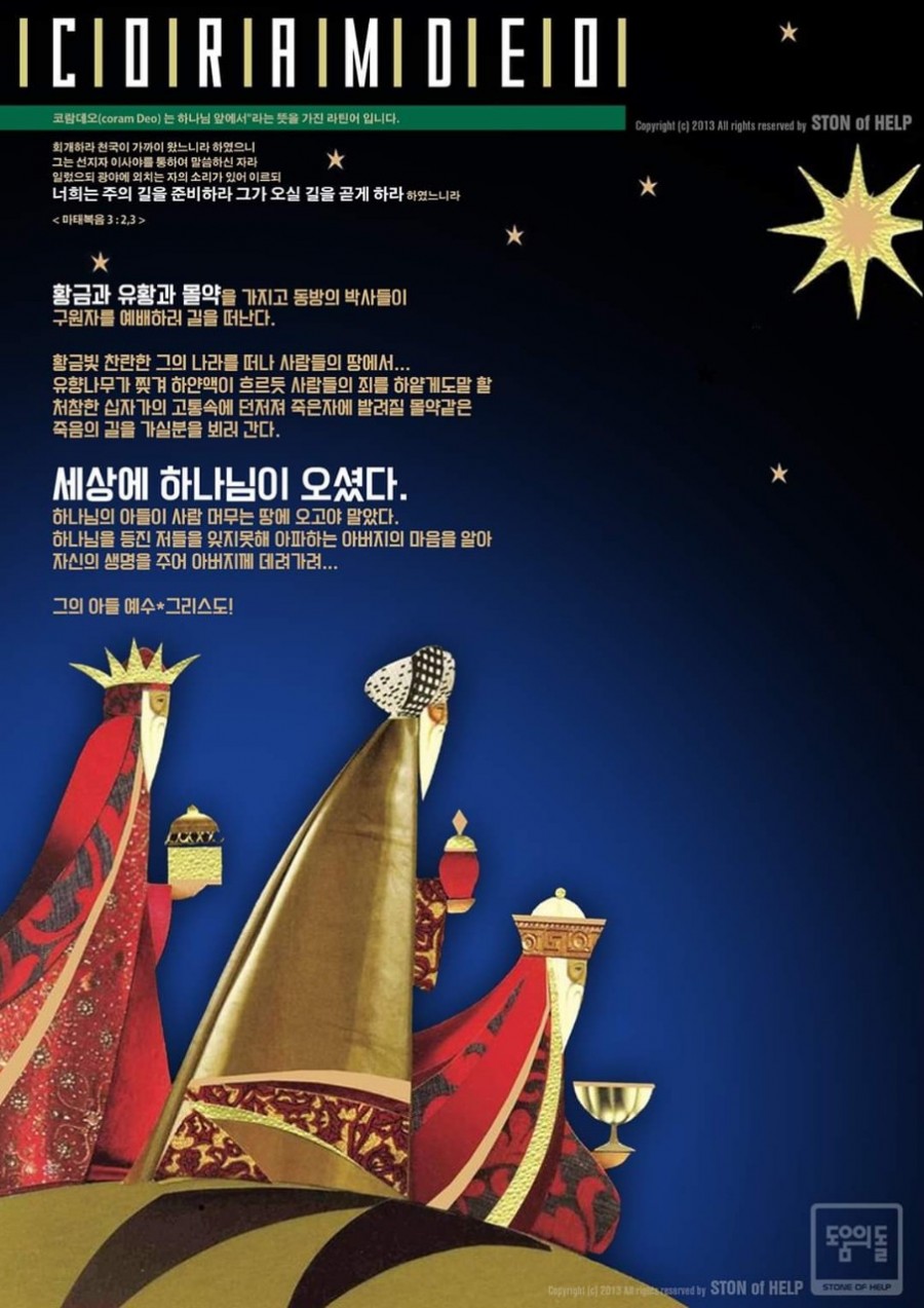 “그들이 별을 보고 매우 크게 기뻐하고 기뻐하더라. 집에 들어가 아기와 그의 어머니 마리아가 함께 있는 것을 보고 엎드려 아기께 경배하고 보배합을 열어 황금과 유향과 몰약을 예물로 드리니라”