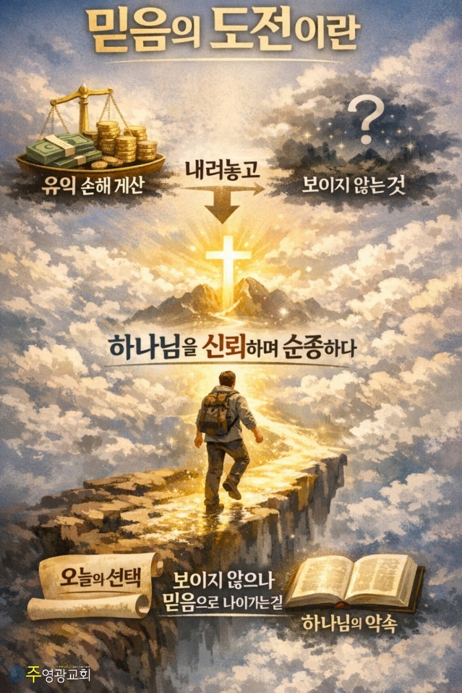 믿음의 도전이란, 보이는 유익과 손해의 계산을 내려놓고, 보이지 않으나 약속하신 하나님을 오늘의 선택으로 신뢰하며 순종하는 것이다.