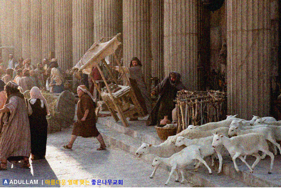 “유대인의 유월절이 가까운지라 예수께서 예루살렘으로 올라가셨더니, 성전 안에서 소와 양과 비둘기 파는 사람들과 돈 바꾸는 사람들이 앉아 있는 것을 보시고, 노끈으로 채찍을 만드사 양이나 소를 다 성전에서 내쫓으시고 돈 바꾸는 사람들의 돈을 쏟으시며 상을 엎으시고, 비둘기 파는 사람들에게 이르시되 이것을 여기서 가져가라 내 아버지의 집으로 장사하는 집을 만들지 말라 하시니”